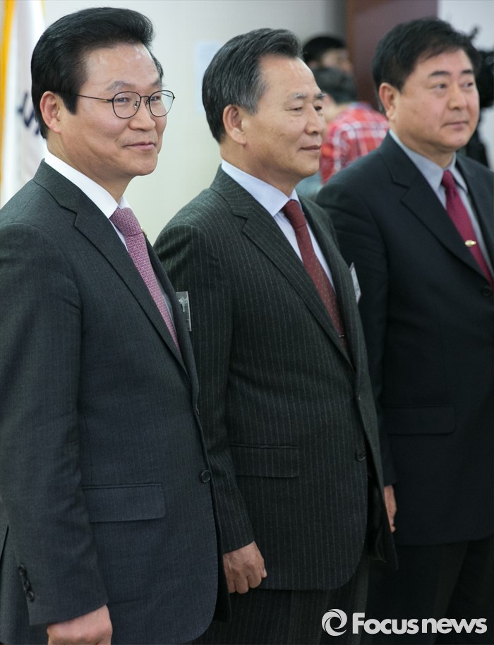 (서울=포커스뉴스) 26일 오후 서울 여의도 새누리당사에서 열린 20대 총선 공천 신청자 면접심사에 대구 달서을에 신청한 김용판(왼쪽) 전 서울지방경찰청장이 참석해 다른 예비후보들과 함께 기념촬영을 하고 있다.