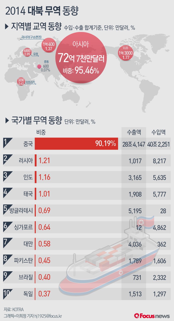 (서울=포커스뉴스) KOTRA가 발표한 '2014 북한 대외무역동향'에 따르면 북한 무역은 아시아지역에 여전히 편중되어있는 것으로 나타났다. 아시아지역의 대북 무역규모는 전년대비 4.1% 증가한 72.7억달러를 기록해 전체비중의 95.46%를 기록했다. 북한의 최대 교역국은 전체 대외 무역의 90.19%를 차지한 중국이다.