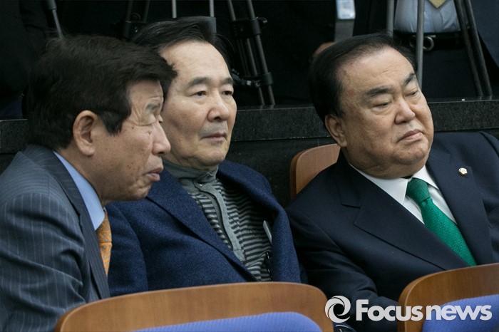 (서울=포커스뉴스) 더불어민주당 유인태(왼쪽부터), 정세균, 문희상 의원이 26일 오후 서울 여의도 국회에서 열린 의원총회에 참석해 대화하고 있다.