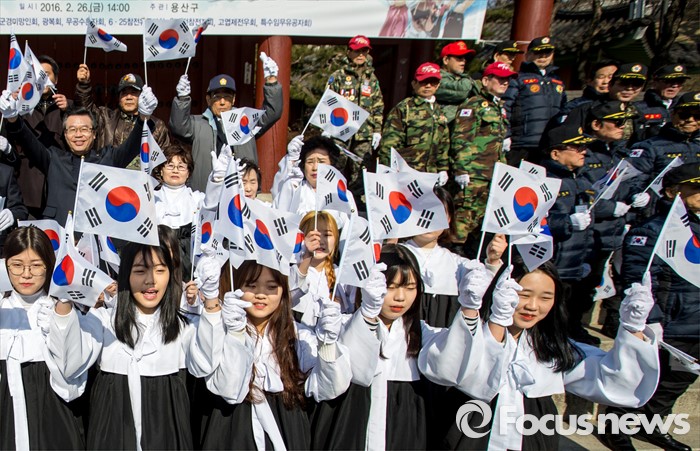 (서울=포커스뉴스) 3.1절을 나흘 앞둔 26일 오후 서울 용산구 효창공원 앞에서 열린 '나라사랑 태극기 만세 행진'에 참가한 성장현 용산구청장을 비롯한 주민들이 태극기를 흔들며 '대한독립 만세'를 외치고 있다.