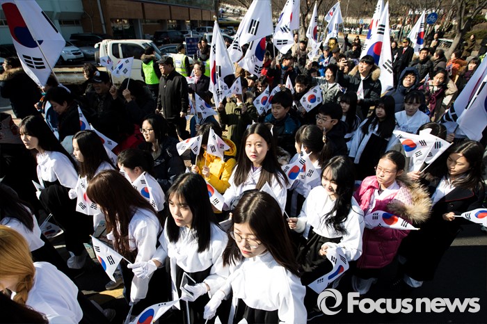 (서울=포커스뉴스) 3.1절을 나흘 앞둔 26일 오후 서울 용산구 효창공원 앞에서 열린 '나라사랑 태극기 만세 행진'에 참가한 주민들이 태극기를 흔들며 행진 하고 있다.