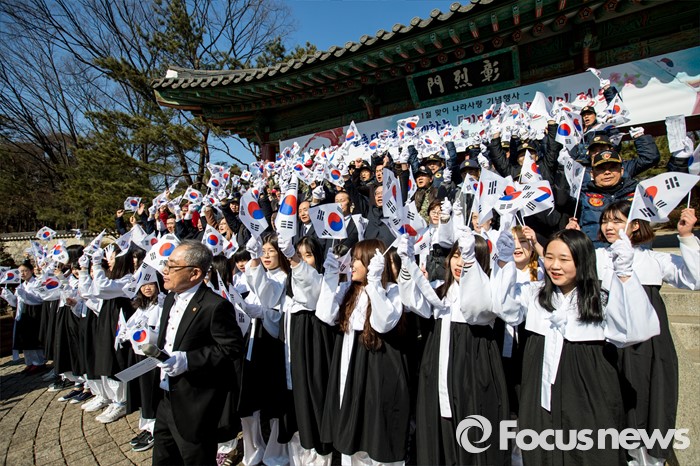 (서울=포커스뉴스) 3.1절을 나흘 앞둔 26일 오후 서울 용산구 효창공원 앞에서 열린 '나라사랑 태극기 만세 행진'에 참가한 성장현 용산구청장을 비롯한 주민들이 태극기를 흔들며 '대한독립 만세'를 외치고 있다.