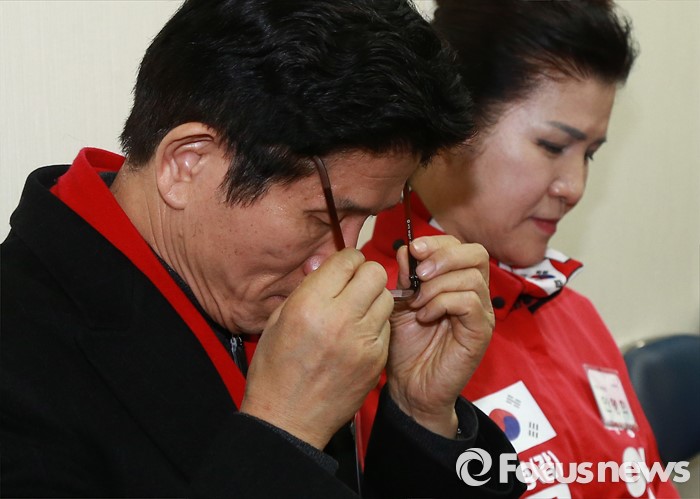 (서울=포커스뉴스) 26일 오후 서울 여의도 새누리당사에서 열린 20대 총선 공천 신청자 면접심사에 참석한 김문수(왼쪽) 대구 수성갑 예비후보가 안경을 고쳐쓰고 있다.