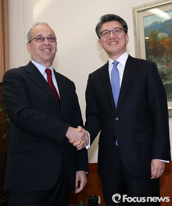 김홍균 외교부 차관보가 26일 오후 서울 종로구 외교부에서 대니얼 러셀(왼쪽) 미 국무부 동아태 차관보와 만나 악수하고 있다.