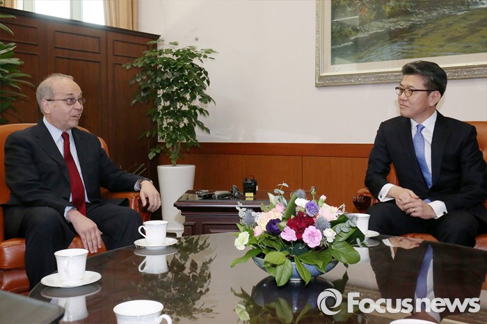 김홍균 외교부 차관보가 26일 오후 서울 종로구 외교부에서 대니얼 러셀(왼쪽) 미 국무부 동아태 차관보와 만나 대화하고 있다.