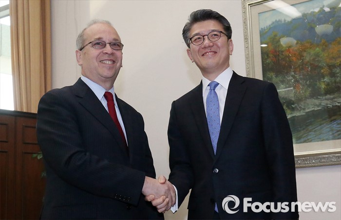 김홍균 외교부 차관보가 26일 오후 서울 종로구 외교부에서 대니얼 러셀(왼쪽) 미 국무부 동아태 차관보와 만나 악수하고 있다.
