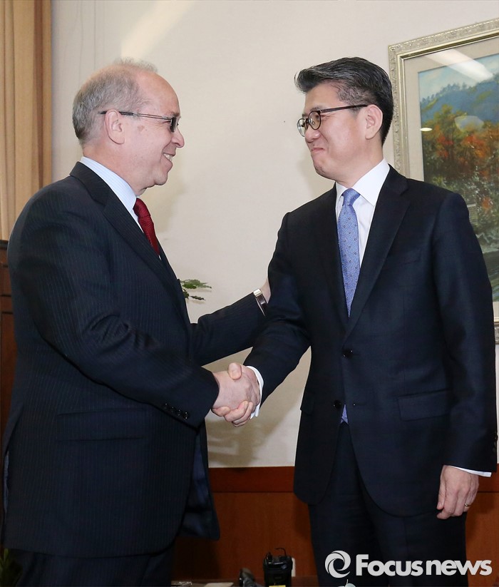 김홍균 외교부 차관보가 26일 오후 서울 종로구 외교부에서 대니얼 러셀(왼쪽) 미 국무부 동아태 차관보와 만나 악수하고 있다.
