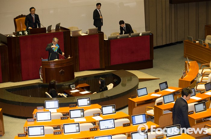 (서울=포커스뉴스) 테러방지법 직권상정에 반발해 야당의 무제한 토론(필리버스터)이 진행되고 있는 26일 오후 서울 여의도 국회 본회의장에서유의동 새누리당 원내대변인이 토론을 진행중인 김용익 더불어민주당 의원을 향해 항의한 뒤 자리로 향하고 있다.
