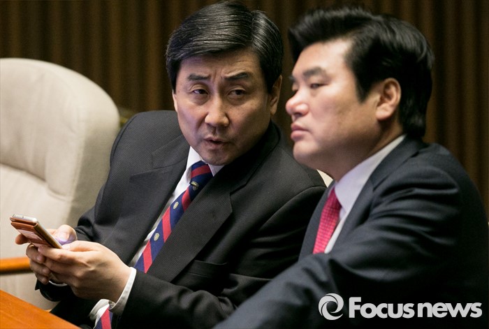 (서울=포커스뉴스) 테러방지법 직권상정에 반발해 야당이 무제한 토론(필리버스터)를 나흘째 진행하고 있는 26일 오후 서울 여의도 국회 본회의장에서 원유철(오른쪽) 새누리당 원내대표와 이종걸 더불어민주당 원내대표가 대화하고 있다.