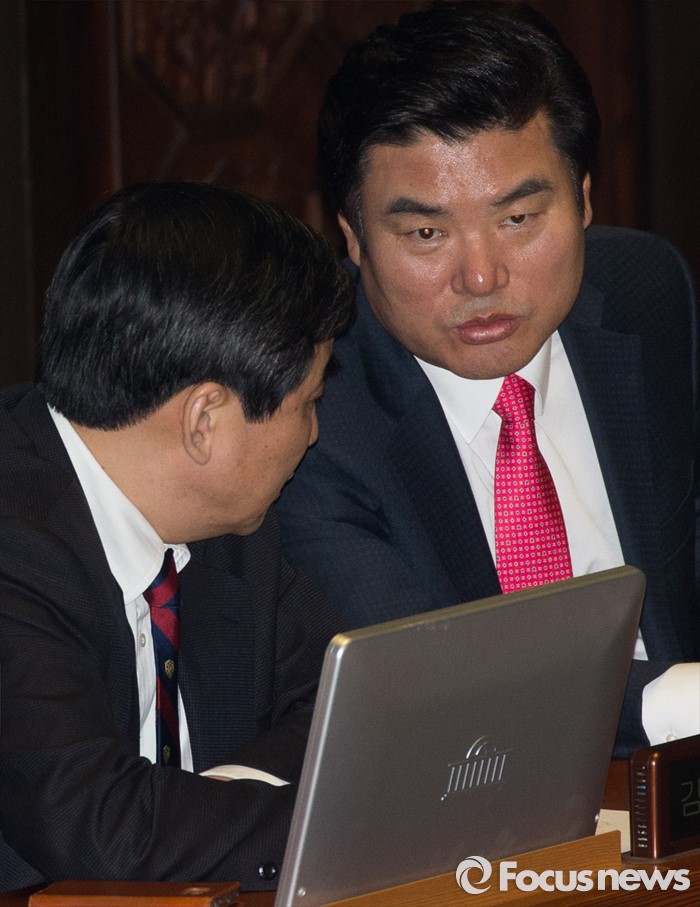 (서울=포커스뉴스) 테러방지법 직권상정에 반발해 야당이 무제한 토론(필리버스터)를 나흘째 진행하고 있는 26일 오후 서울 여의도 국회 본회의장에서 원유철(오른쪽) 새누리당 원내대표와 이종걸 더불어민주당 원내대표가 대화를 나누고 있다.