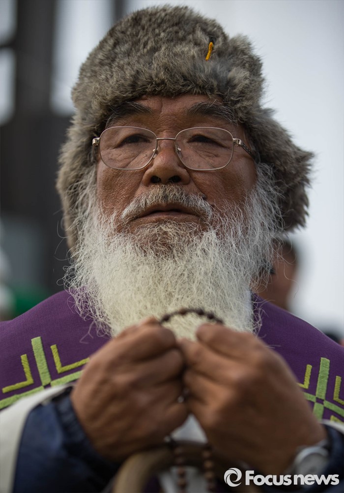 (서귀포=포커스뉴스) 문정현 신부가 26일 오전 준공식이 열리는 제주민군복합형관광미항(제주해군기지) 정문 앞 부근에서 기지 건설을 반대하며 기도를 하고 있다.