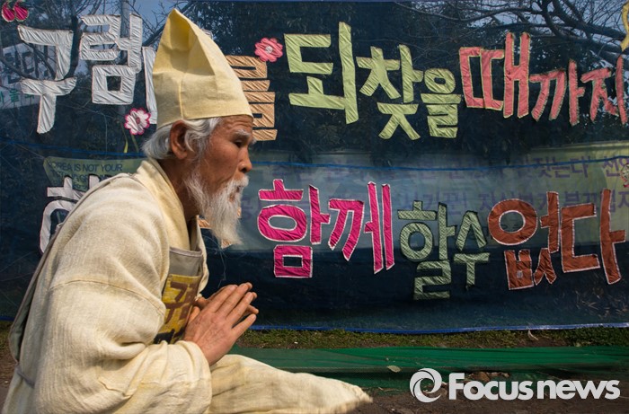 (서귀포=포커스뉴스) 26일 오전 제주 서귀포시 강정마을에서 주민들과 기지 건설을 반대하는 활동가들이 준공식이 열리는 제주 군복합형관광미항(제주해군기지) 정문 앞 부근에서 시위를 하고 있다.