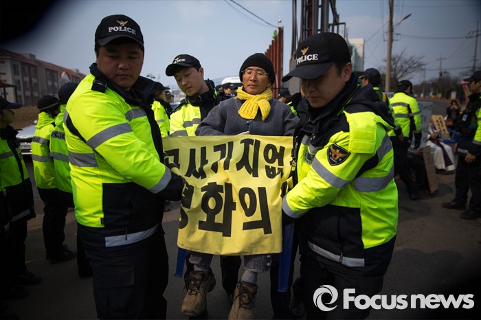 (서귀포=포커스뉴스) 26일 오전 제주 서귀포시 강정마을에서 주민들과 기지 건설을 반대하는 활동가들이 준공식이 열리는 제주 군복합형관광미항(제주해군기지) 정문 앞 부근에서 시위를 하고 있다.