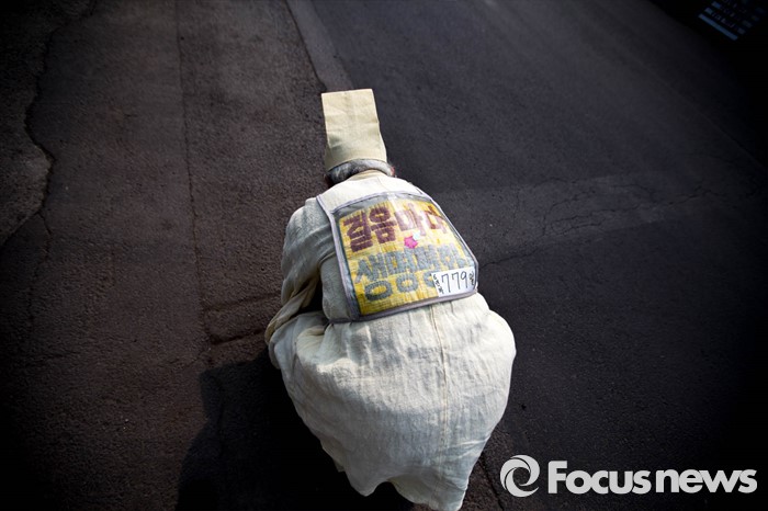 (서귀포=포커스뉴스) 26일 오전 제주 서귀포시 강정마을에서 주민들과 기지 건설을 반대하는 활동가들이 준공식이 열리는 제주 군복합형관광미항(제주해군기지) 정문 앞 부근에서 시위를 하고 있다.