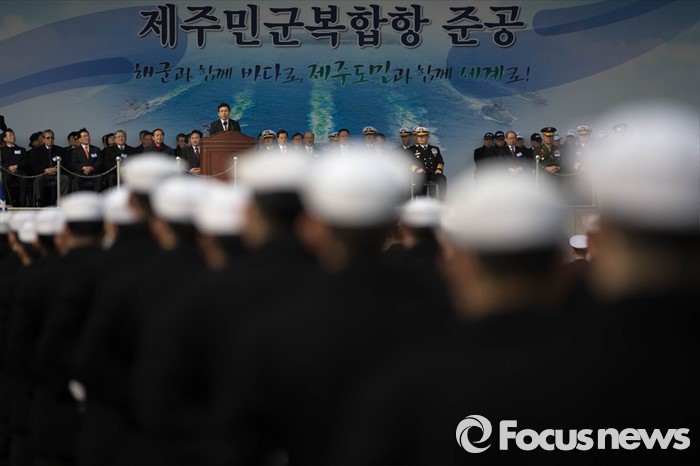 (서귀포=포커스뉴스) 황교안 국무총리가 26일 오후 제주 서귀포 제주해군기지에서 열린 '제주민군복합형관광미항' 준공식에 참석, 축사를 하고 있다.