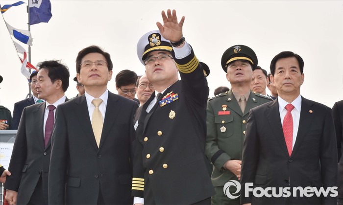(서울=포커스뉴스) 황교안 국무총리가 26일 오후 제주 서귀포 제주해군기지에서 열린 제주민군복합형관광미항 준공식에 참석해 이지스구축함 서애류성룡함을 둘러보고 있다. <사진제공=해군>