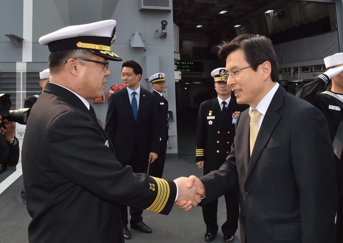 (서울=포커스뉴스) 황교안(오른쪽) 국무총리가 26일 오후 제주 서귀포 제주해군기지에서 열린 제주민군복합형관광미항 준공식에 참석해 이지스구축함 서애류성룡함에서 관계자와 악수하고 있다. <사진제공= 해군>