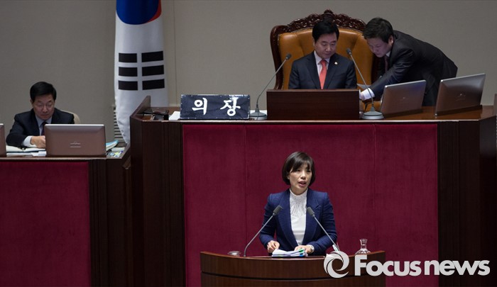 (서울=포커스뉴스) 테러방지법 직권상정에 반발해 야당의 무제한 토론(필리버스터)이 나흘째 진행되고 있는 26일 오후 서울 여의도 국회 본회의장에 14번째 필리버스터로 나선 배재정 더불어민주당 의원이 발언하고 있다.