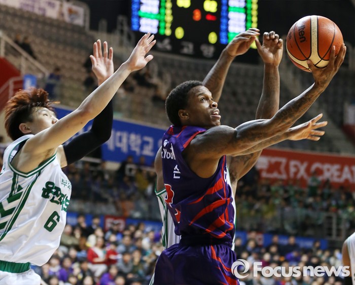 (고양=포커스뉴스) 26일 고양체육관에서 열린 2015-2016 프로농구 오리온-동부 6강 플레이오프 1차전에서 오리온 조 잭슨이 동부 두경민과 맥키네스의 수비를 뚫고 리버스 레이업슛을 시도하고 있다.