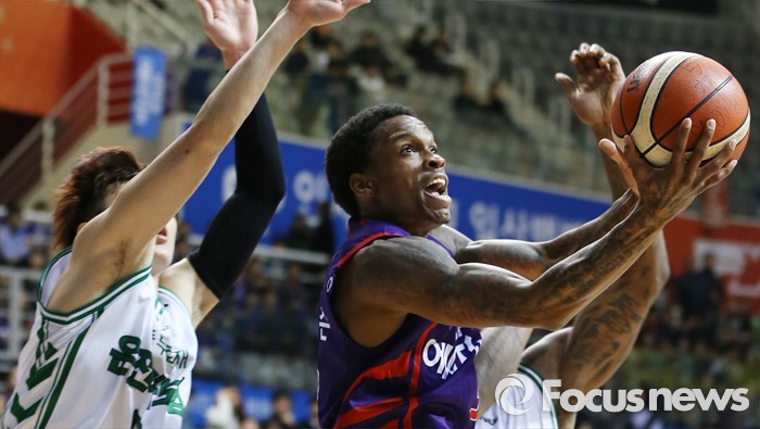 (고양=포커스뉴스) 26일 고양체육관에서 열린 2015-2016 프로농구 오리온-동부 6강 플레이오프 1차전에서 오리온 조 잭슨이 동부 두경민과 맥키네스의 수비를 뚫고 리버스 레이업슛을 시도하고 있다.