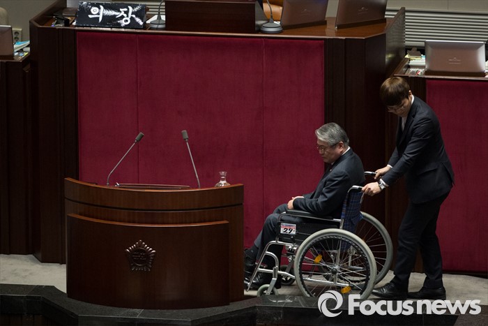 (서울=포커스뉴스) 테러방지법 직권상정에 반발해 야당의 무제한 토론(필리버스터)이 나흘째 진행되고 있는 26일 오후 서울 여의도 국회 본회의장에서 휠체어를 타고 온 김용익 더불어민주당 의원이 발언을 끝낸 후, 불편한 몸을 이끌고 발언대 밖으로 나오고 있다.