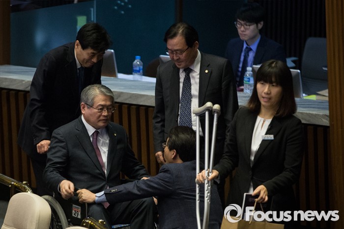 | △ 휠체어 타고 퇴장하는 김용익 의원 |
