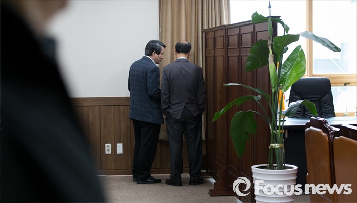 (서울=포커스뉴스) 27일 오후 서울 관악구 중앙선거관리위원회 관악청사에서 선거구획정위 전체회의에 참석한 박영수(뒷모습) 선거구획정위원회 위원장이 회의 시작 전 김동욱 위원과 이야기를 나누고 있다.