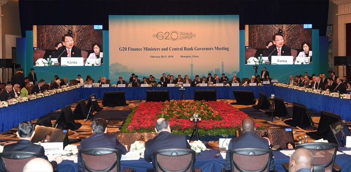 (서울=포커스뉴스) 유일호 부총리 겸 기획재정부 장관이 27일 (현지시간) 중국 상해에서 열린 G20재무장관.중앙은행총재회의 참석, 거시정책공조 세션에서 발언을 하고 있다. <사진제공=기획재정부>