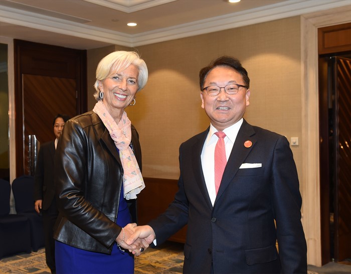 | △ 크리스틴 라가르드 IMF총재와 악수하는 유일호 부총리 |