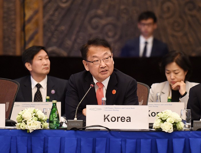 (서울=포커스뉴스) 유일호 부총리 겸 기획재정부 장관이 27일 (현지시간) 중국 상해에서 열린 G20재무장관.중앙은행총재회의 참석, 거시정책공조 세션에서 발언을 하고 있다. <사진제공=기획재정부>