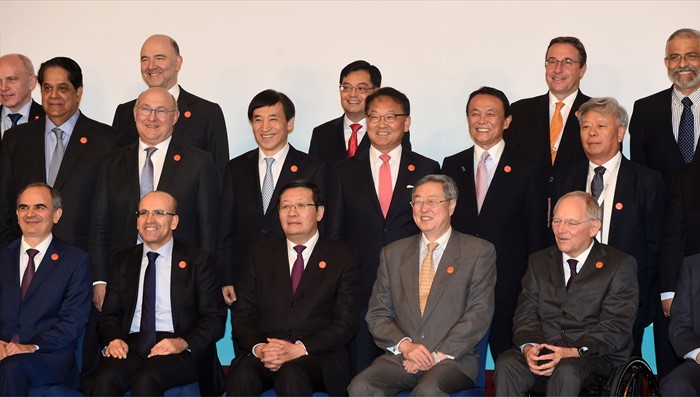 (서울=포커스뉴스) 유일호 부총리 겸 기획재정부 장관이 27일 중국 상해 푸동 상글리라 호텔에서 열린 G20재무장관.중앙은행총재회의 참석, 각국 참석자들과 기념촬영을 하고 있다. <사진제공=기획재정부>