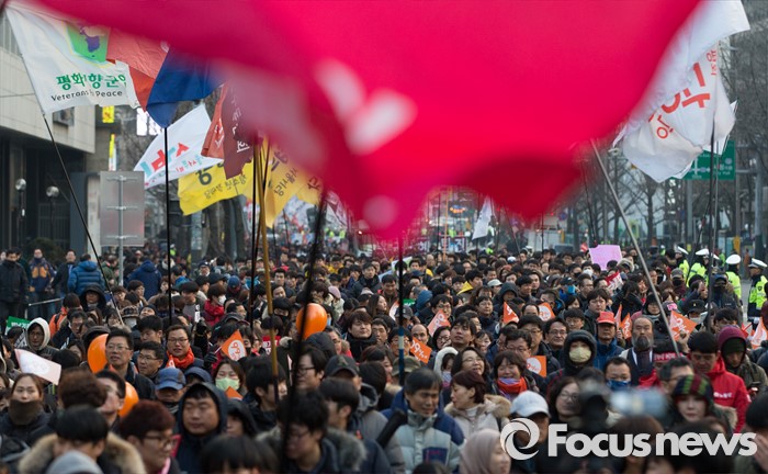 (서울=포커스뉴스) 27일 오후 서울광장에서 민주노총과 참여연대, 전국빈민연합 등 시민사회단체들이 4차 민중총궐기 집회를 마치고 행진하고 있다.