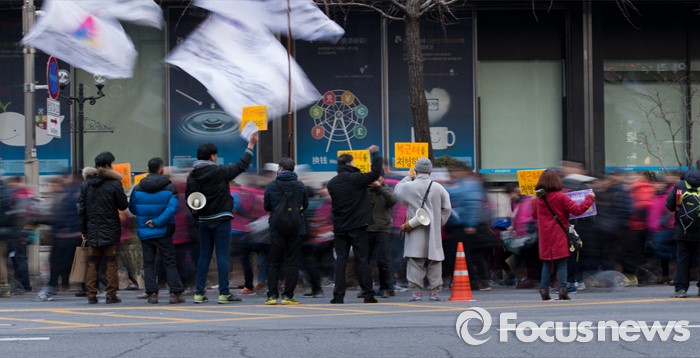 (서울=포커스뉴스) 27일 오후 서울광장에서 민주노총과 참여연대, 전국빈민연합 등 시민사회단체들이 4차 민중총궐기 집회를 마치고 행진하고 있다.
