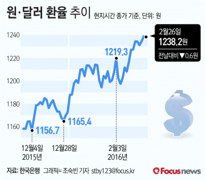 (서울=포커스뉴스) 26일 서울 외환시장에서 원·달러 환율은 전 거래일 대비 0.6원 하락(원화 가치 상승)한 1238.2원에 최종호가됐다.
