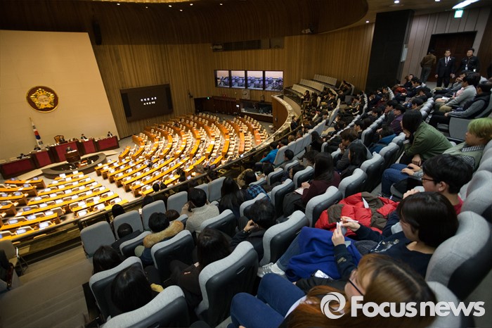 (서울=포커스뉴스) 테러방지법 직권상정에 반발해 야당의 무제한 토론(필리버스터)이 진행되고 있는 28일 오후 서울 여의도 국회 본회의 장에서 23번째 토론에 참여한 이학영 더불어민주당 의원이 발언하고 있는 가운데 시민 방청객들이 지켜보고 있다.