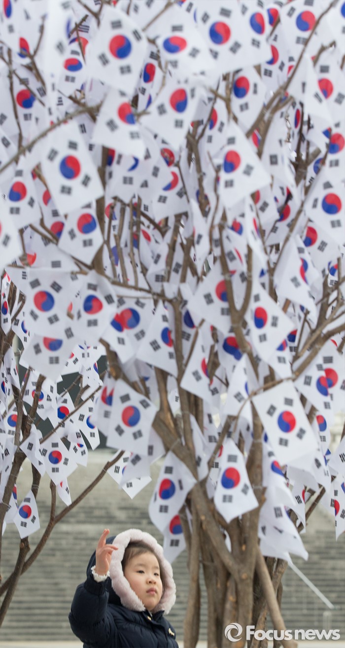 (천안=포커스뉴스) 3.1절을 이틀 앞둔 28일 오후 충남 천안 독립기념관을 찾은 어린이가 광장에 마련된 태극기 나무에 덜린 태극기를 바라보고 있다.