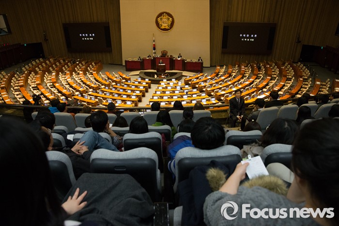 (서울=포커스뉴스) 테러방지법 직권상정에 반발해 야당의 무제한 토론(필리버스터)이 진행되고 있는 28일 오후 서울 여의도 국회 본회의 장에서 23번째 토론에 참여한 이학영 더불어민주당 의원이 발언하고 있는 가운데 시민 방청객들이 지켜보고 있다.