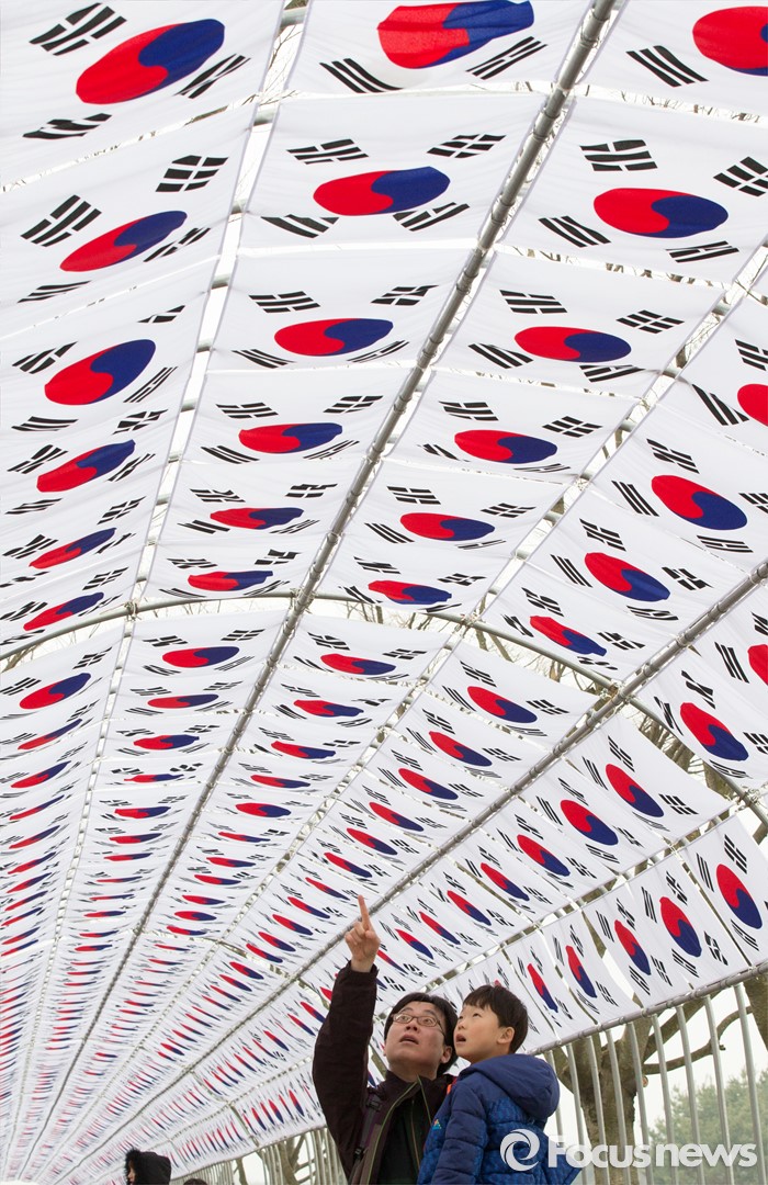 (천안=포커스뉴스) 3.1절을 이틀 앞둔 28일 오후 충남 천안 독립기념관을 찾은 시민들이 광장에 마련된 태극기 터널을 지나고 있다.