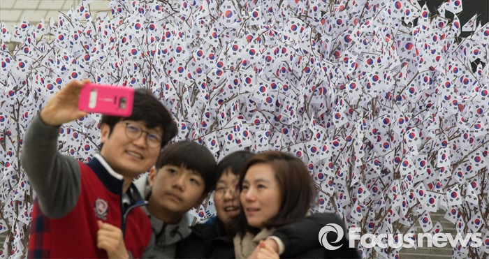 (천안=포커스뉴스) 3.1절을 이틀 앞둔 28일 오후 충남 천안 독립기념관을 찾은 시민들이 광장에 마련된 태극기 나무 앞에서 사진을 찍고 있다.
