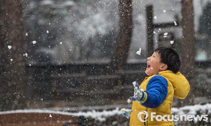 (서울=포커스뉴스) 수도권과 전국 곳곳에에 강한 바람과 함께 기습적인 폭설이 내린 28일 오후 서울 강북구 솔밭공원에서 한 어린이가 즐겁게 뛰어놀고 있다.