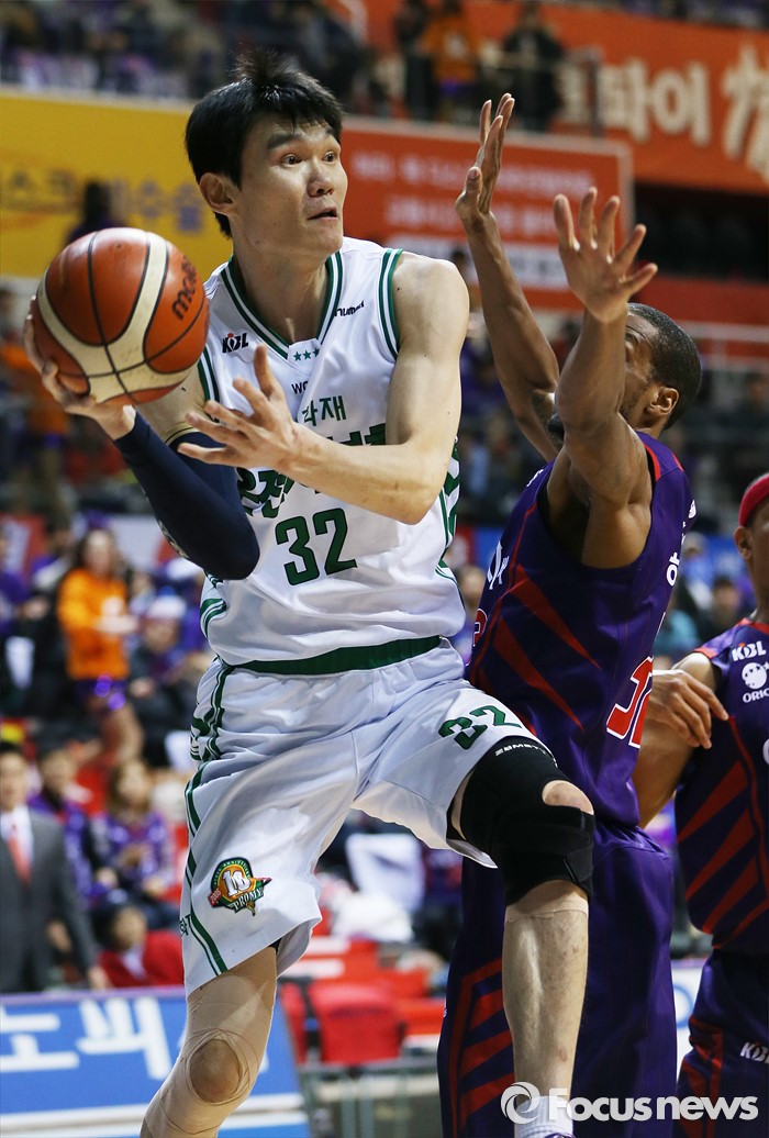 (고양=포커스뉴스) 28일 고양체육관에서 열린 2015-2016 프로농구 오리온-동부 6강 플레이오프 2차전에서 동부 김주성이 오리온 애런 헤인즈의 마크를 피하며 골밐에서 패스를 시도하고 있다.
