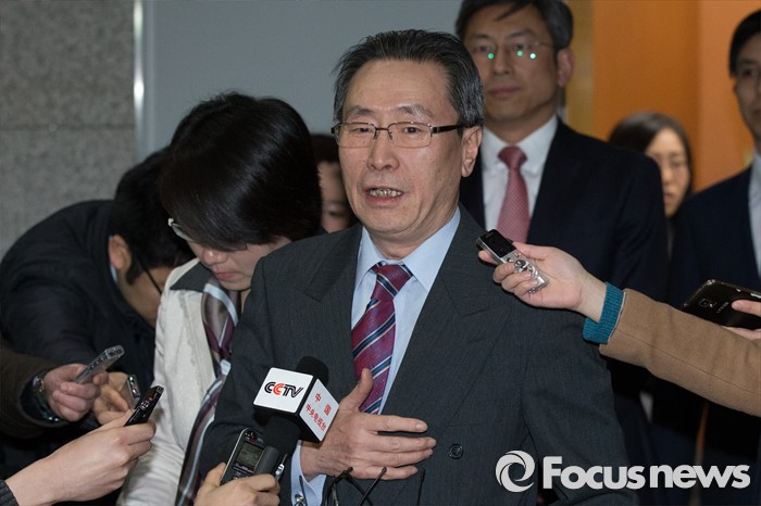 (서울=포커스뉴스) 중국 측 수석대표인 우다웨이 중국 외교부 한반도사무특별대표가 28일 오후 서울 종로구 외교부 청사에서 북핵 6자회담의 우리 측 수석대표인 황준국 외교부 한반도평화교섭본부장과의 면담을 끝내고, 취재진의 질문에 대답하고 있다.