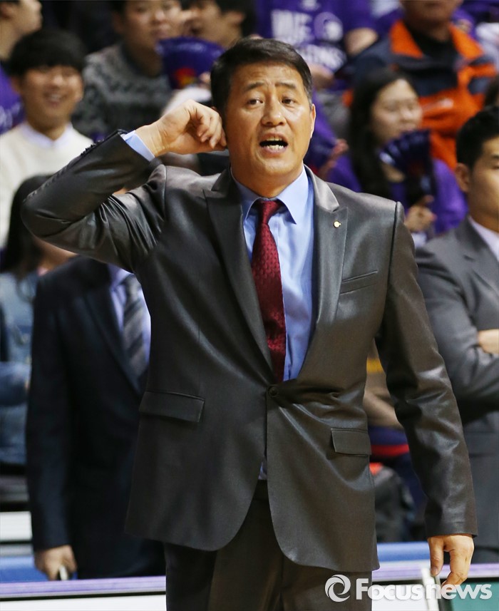 (고양=포커스뉴스) 28일 고양체육관에서 열린 2015-2016 프로농구 오리온-동부 6강 플레이오프 2차전에서 오리온 추링승 감독이 귀를 만지며 공격 전술 사인을 보내고 있다.