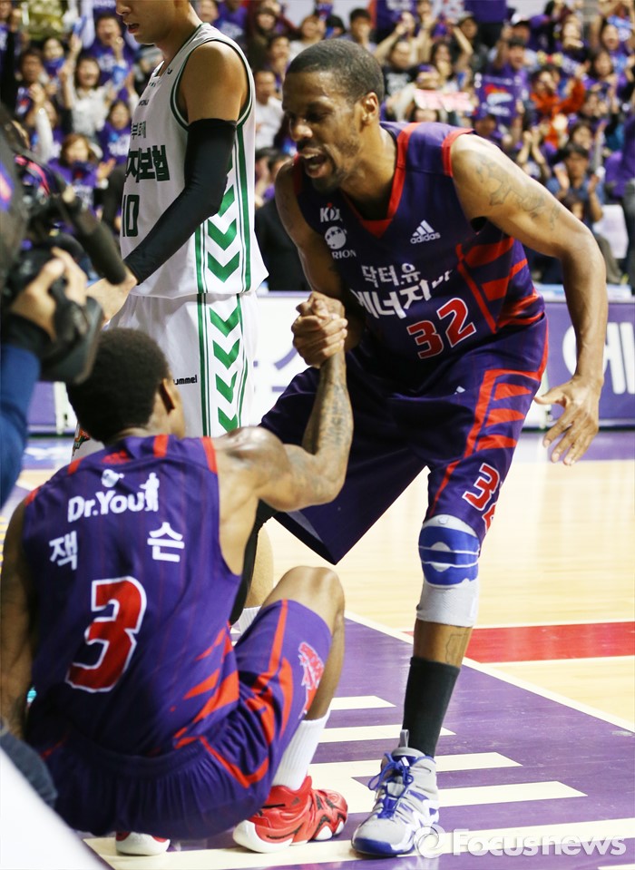 (고양=포커스뉴스) 28일 고양체육관에서 열린 2015-2016 프로농구 오리온-동부 6강 플레이오프 2차전에서 레이업슛을 성공하고 넘어진 오리온 조 잭슨을 헤인즈가 일으켜주고 있다.