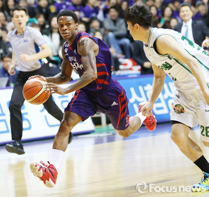 (고양=포커스뉴스) 28일 고양체육관에서 열린 2015-2016 프로농구 오리온-동부 6강 플레이오프 2차전에서 오리온 조 잭슨이 동부 박지현의 마크를 피해 드리블하고 있다.