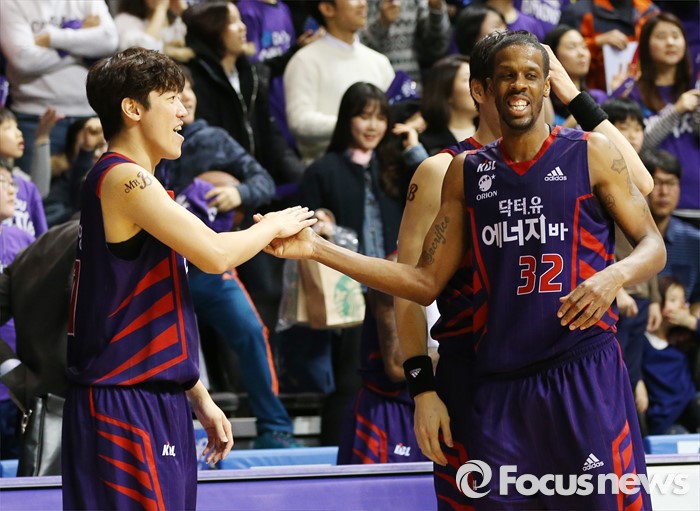 (고양=포커스뉴스) 28일 고양체육관에서 열린 2015-2016 프로농구 오리온-동부 6강 플레이오프 2차전에서 오리온 허일영과 헤인즈가 경기를 마친후 악수하고 있다.