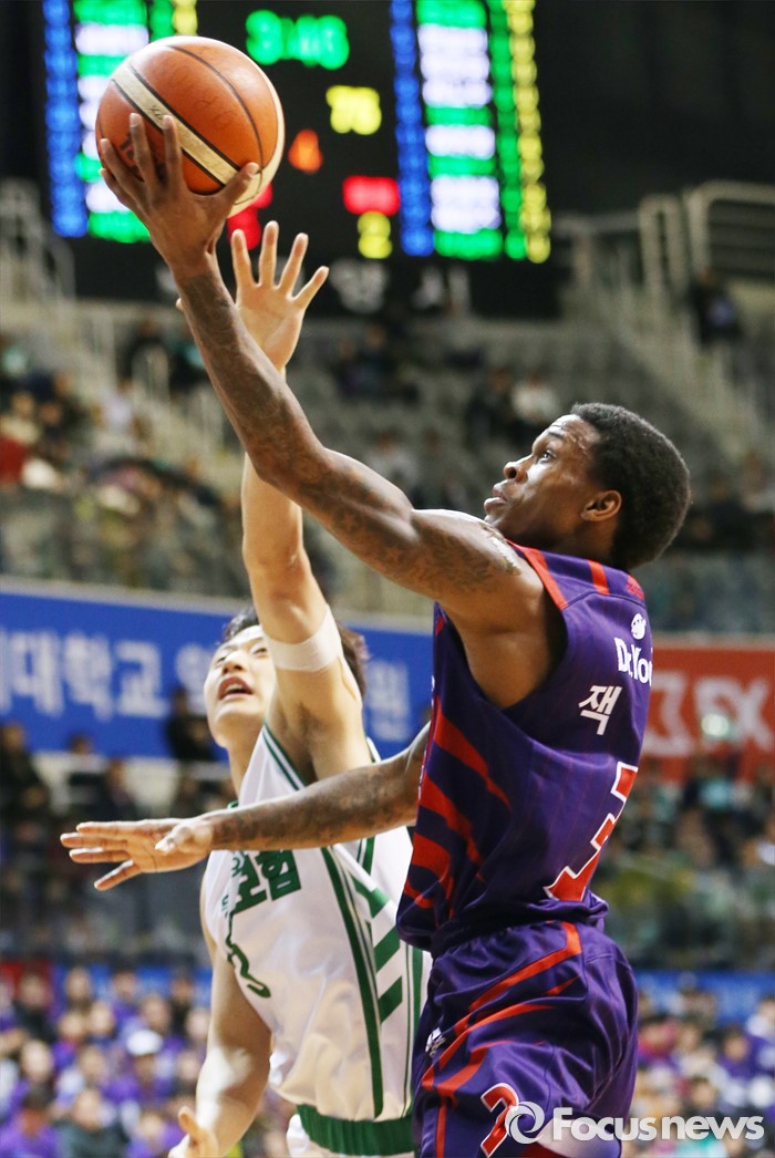 (고양=포커스뉴스) 28일 고양체육관에서 열린 2015-2016 프로농구 오리온-동부 6강 플레이오프 2차전에서 오리온 조 잭슨이 동부 허웅의 마크를 뚫고 레이업슛을 쏘고 있다.