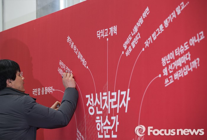 (서울=포커스뉴스) 29일 오전 서울 여의도 국회에서 새누리당 최고위원회의에 앞서 한 당직자가 새로 설치한 국민의 쓴소리 백보드의 오탈자를 수정하고 있다.