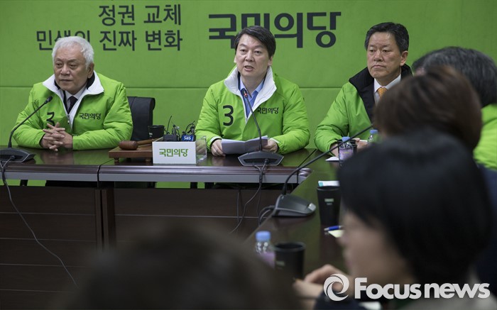 (서울=포커스뉴스) 국민의당 안철수 상임공동대표가 서울 마포구 국민의당 당사에서 열린 최고위원회의에서 모두발언을 하고 있다. 왼쪽부터 김한길 상임공동선대위원장, 안철수 상임공동대표, 주승용 원내대표