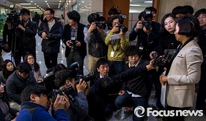 | △ 취재진 질문에 답하는 전정희 의원 |